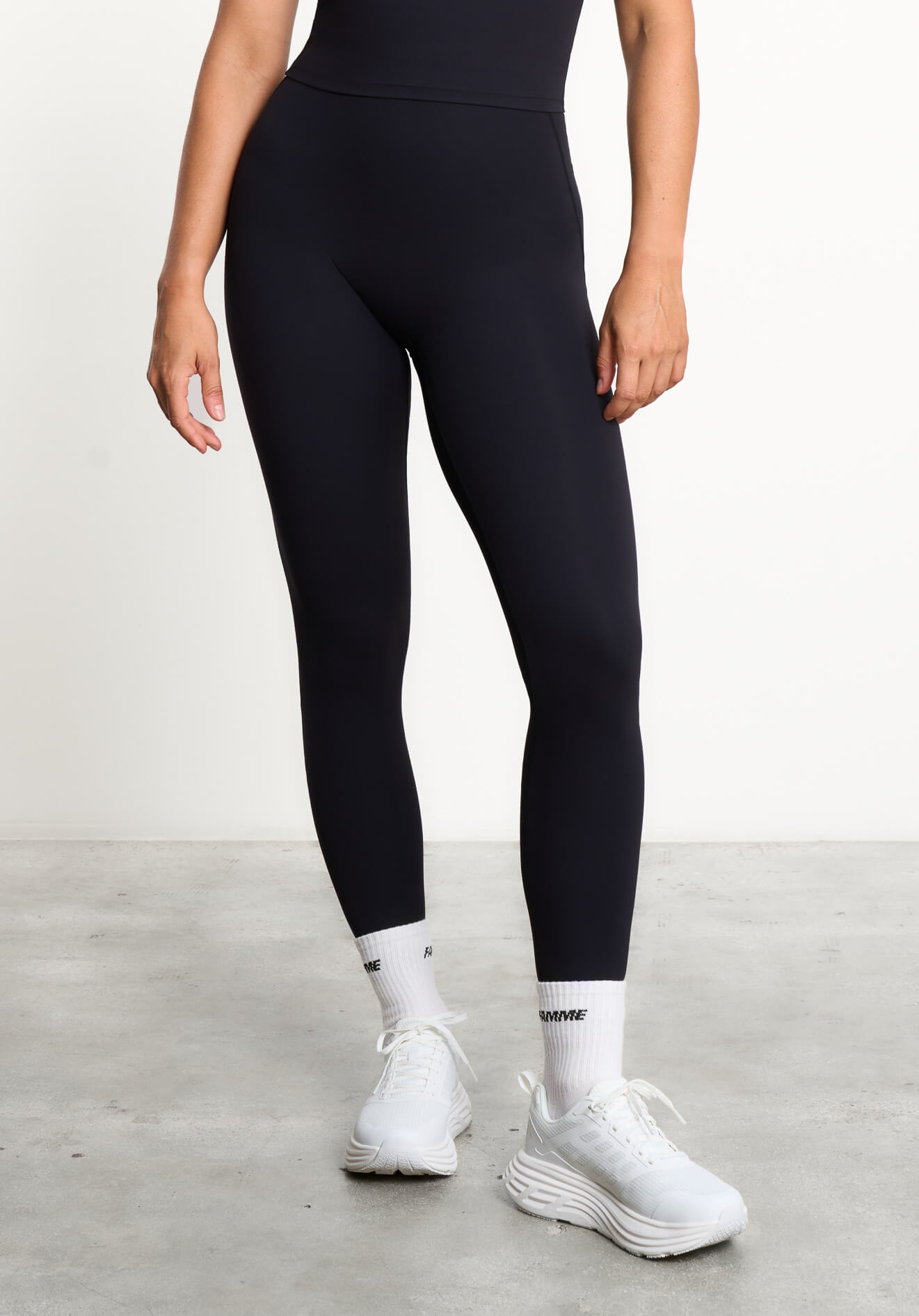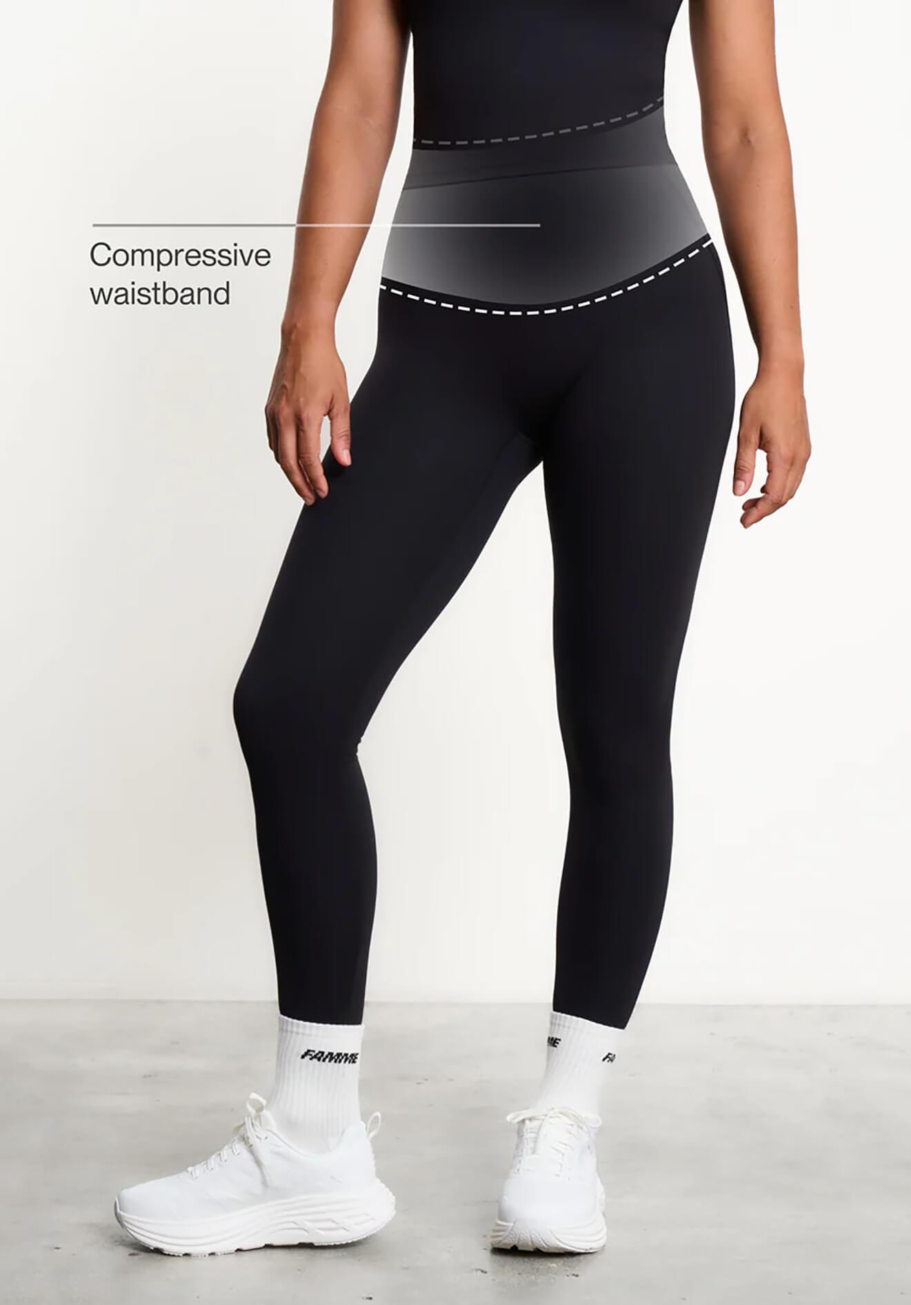 Det strækbare materiale transporterer fugt væk fra kroppen og giver både bagdel og mave en flatterende pasform. Stoffet er laserskåret for at minimere friktion, og indersiden af linningen har en diskret silikonmembran uden sæmme.